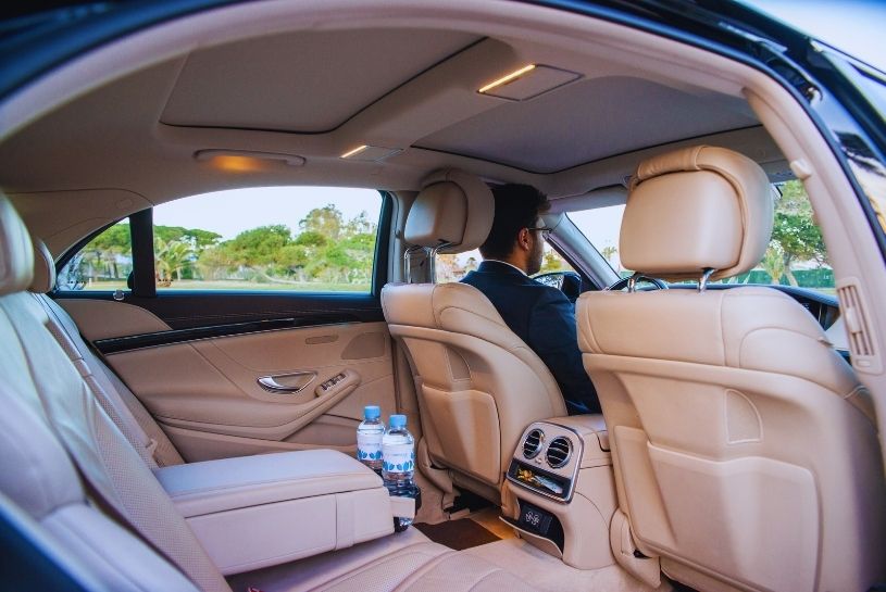 Interior espacioso y elegante de un vehículo de transfer de lujo, con asientos de cuero y acabados premium.
